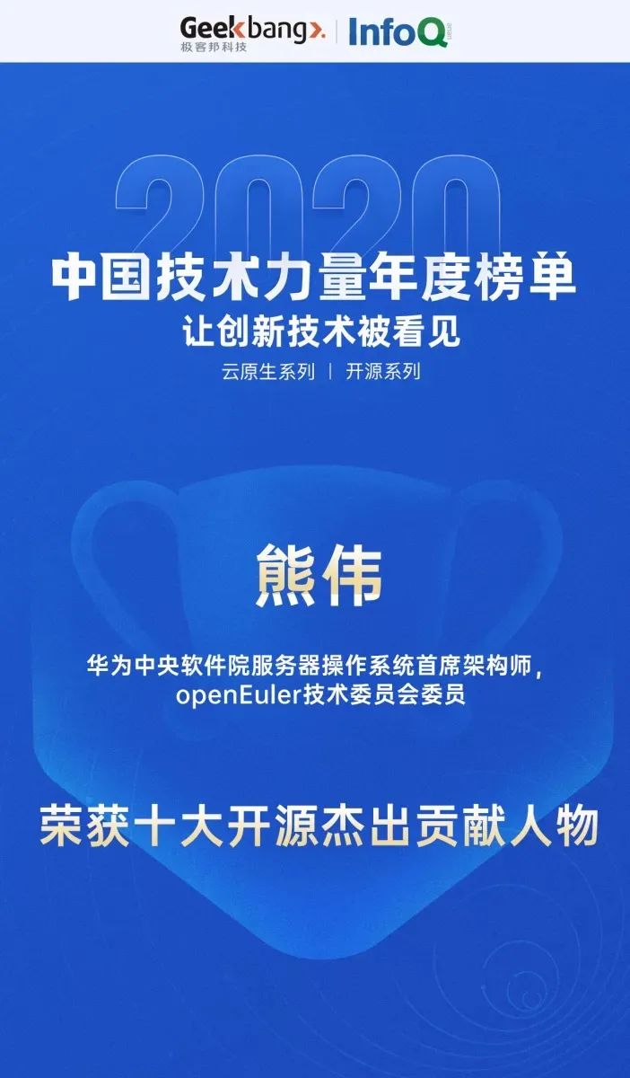 openEuler 技术委员会委员熊伟荣获中国技术力量年度榜单十大开源杰出贡献人物奖。