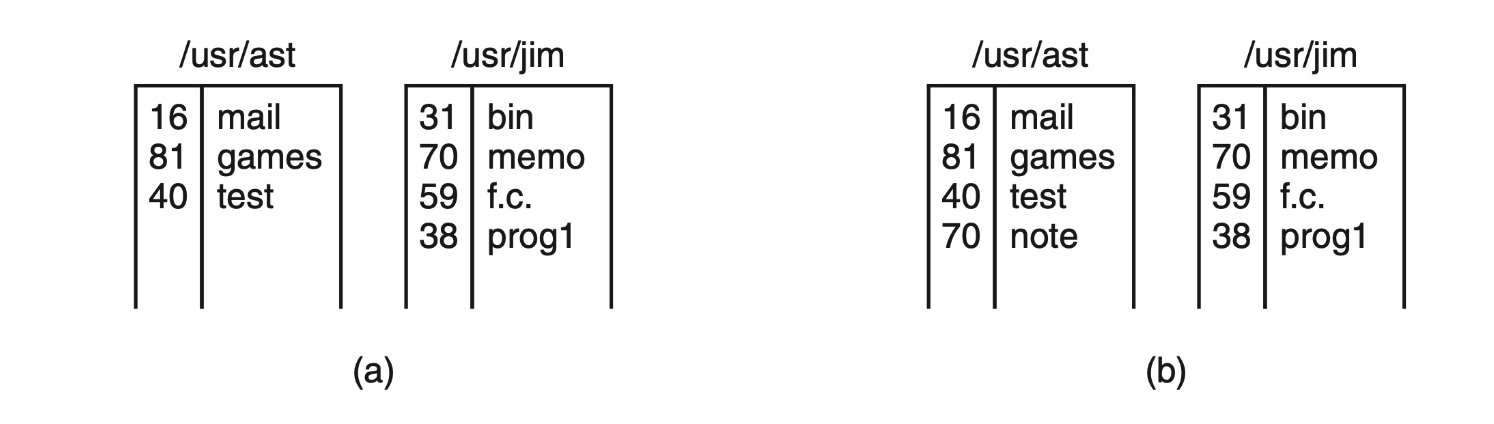 jim 中的 memo 文件现在会进入到 ast 的目录中,在 note 名称下。此后,/usr/jim/memo和 /usr/ast/note 会有相同的名称。
