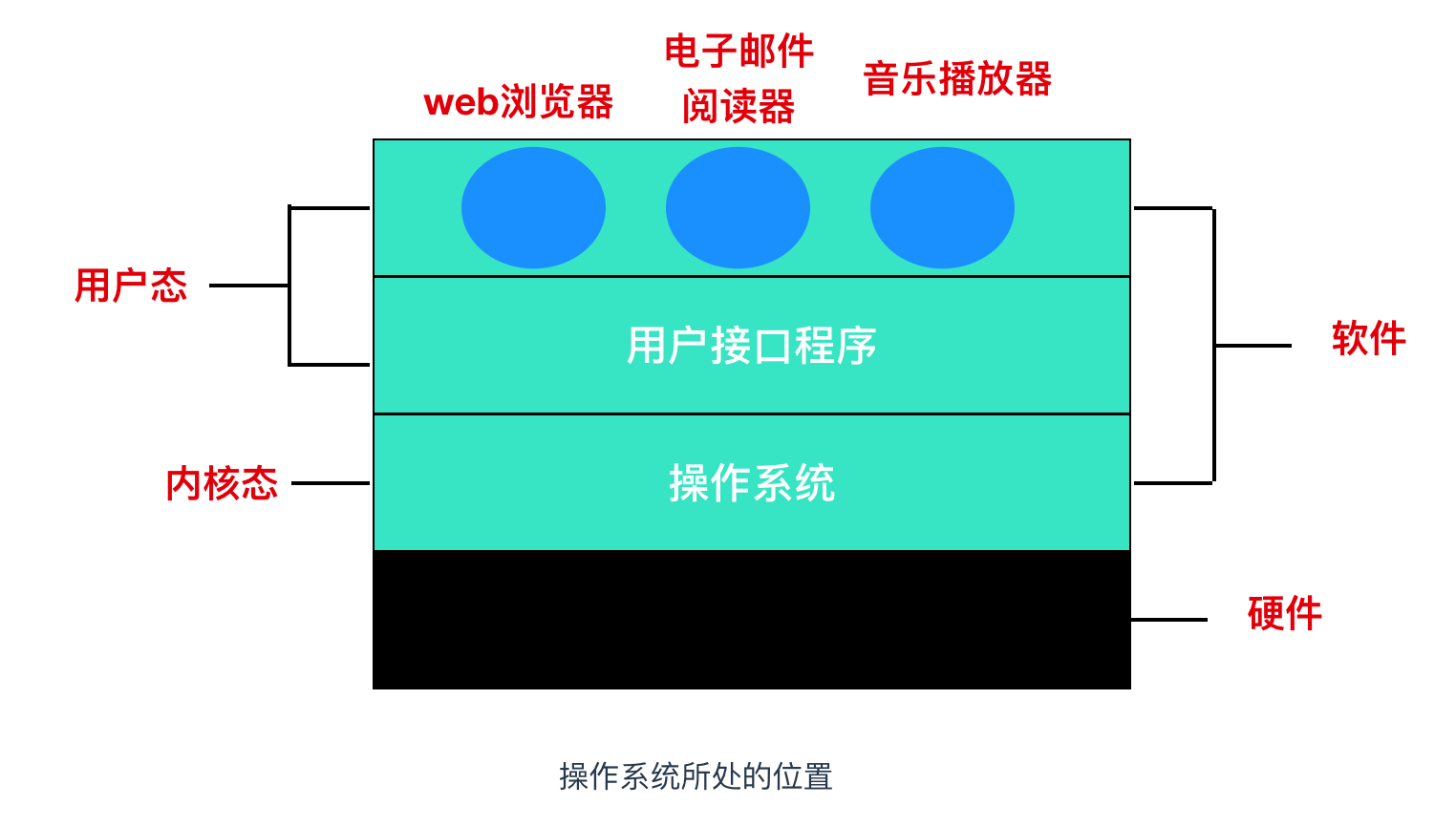 用户接口程序(shell 或者 GUI) 处于用户态中,并且它们位于用户态的最低层,允许用户运行其他程序,例如 Web 浏览器、电子邮件阅读器、音乐播放器等。而且,越靠近用户态的应用程序越容易编写,如果你不喜欢某个电子邮件阅读器你可以重新写一个或者换一个,但你不能自行写一个操作系统或者是中断处理程序。这个程序由硬件保护,防止外部对其进行修改。