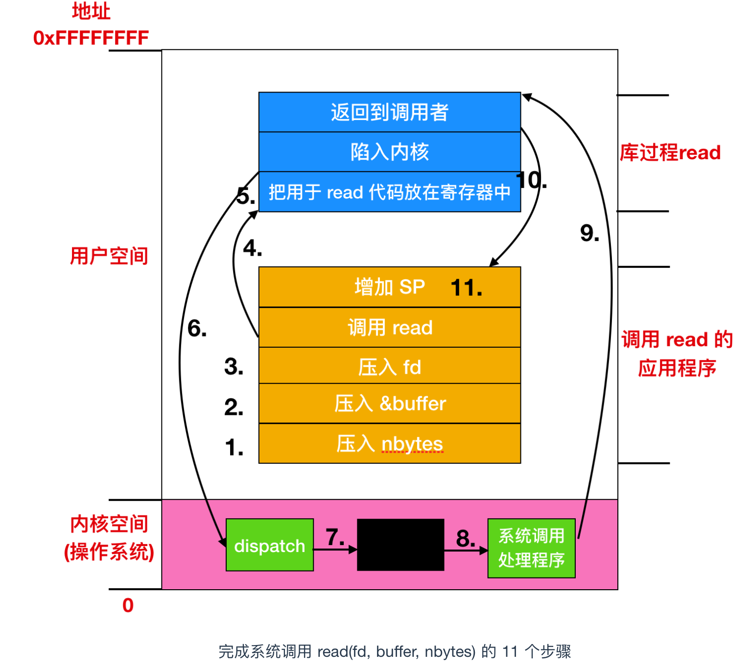 为了获取操作系统的服务,用户程序必须使用 系统调用(system call),系统调用会转换为内核态并且调用操作系统。TRAP 指令用于把用户态切换为内核态并启用操作系统。当有关工作完成之后,在系统调用后面的指令会把控制权交给用户程序。我们会在后面探讨操作系统的调用细节。