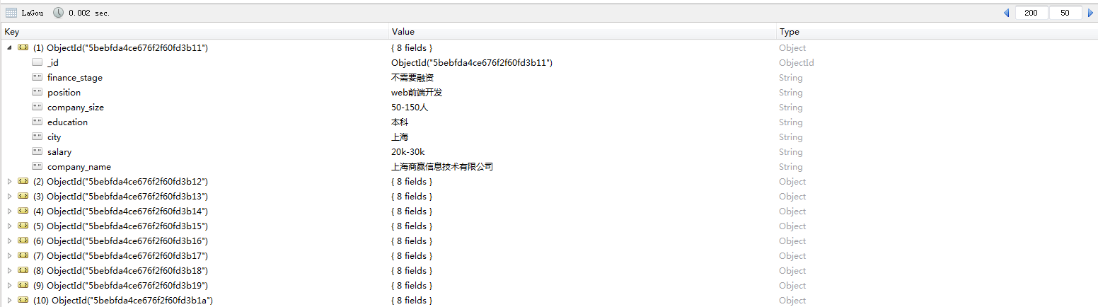 要想我们的爬虫不被检测出来,我们可以使用代理IP,而网上有很多提供免费代理的网站,比如西刺代理、快代理、89免费代理等等,我们可以爬取一些免费的代理然后搭建我们的代理池,使用的时候直接从里面进行调用就好了。然后通过观察可以发现,拉勾网最多显示30页职位信息,一页显示15条,也就是说最多显示450条职位信息。在ajax接口返回的结果中可以看到有一个totalCount字段,而这个字段表示的就是查询结果的数量,获取到这个值之后就能知道总共有多少页职位信息了。对于爬取下来的结果,保存在MongoDB数据库中。