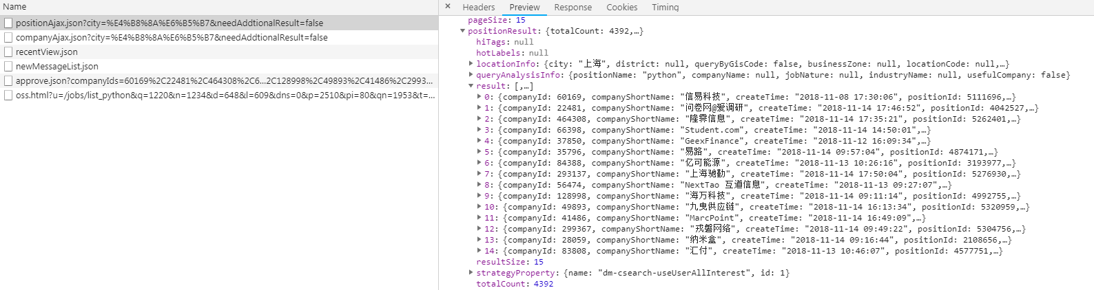 对于拉勾网,我们要找到职位信息的ajax接口倒是不难(如下图),问题是怎么不得到上面的结果。