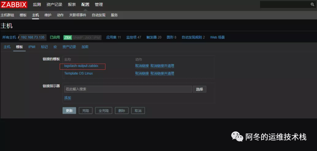 在上面创建了一个模板和监控项,接着还需要将此模板链接到192.168.73.135主机上,选择“配置”—-“主机”,然后选中192.168.73.135主机,选择“模板”标签,将上面创建的模板加入到192.168.73.135主机上,如下图所示: