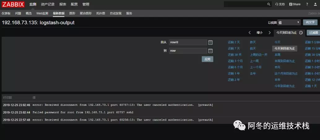 下面我们模拟一个故障,在任意主机通过ssh登录192.168.73.135主机,然后输入一个错误密码,让系统的/var/log/secure文件产生错误日志,然后看看logstash是否能够过滤到,是否能够发送到zabbix中