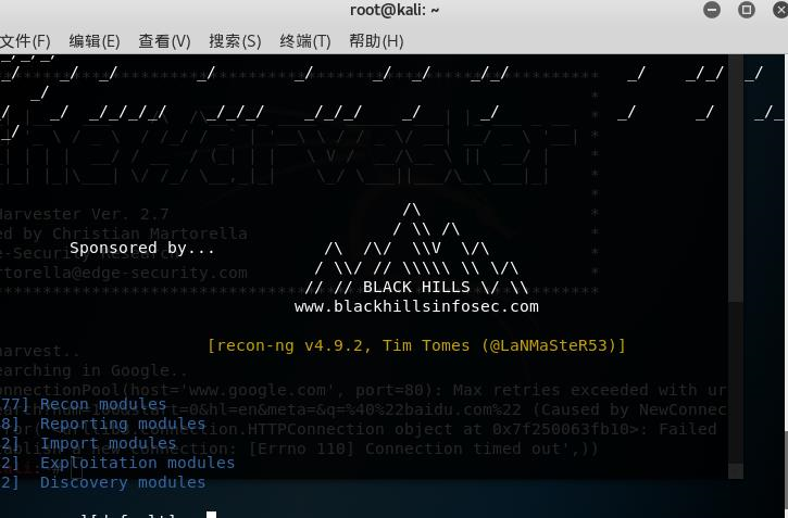 (4)metagoofil metagoofil可以收集 word、ppt、Excel、PDF 类型的信息 (5)recon-ng Recon-NG是由python编写的一个开源的Web侦查(信息收集)框架。Recon-ng框架是一个强大的工具,使用它可以自动的收集信息和网络侦查。recon-ng有侦察reconnaissance、发现discovery、汇报reporting、攻击exploitation四大块模块。