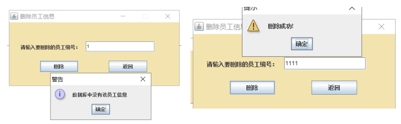 (3)测试删除员工信息:点击删除按钮后,查询数据库中是否已有该员工信息,有的话就将该条员工信息插入数据库中,没有的话就跳出提示框-数据库中没有该员工信息。