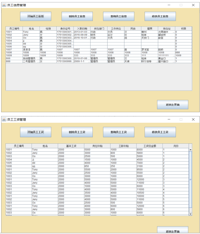 (5)至于员工工资信息管理的操作也跟员工信息管理的操作差不多,基本上逻辑都是一样的,就除了所管理的信息内容有所差别,以下是二者的比较: