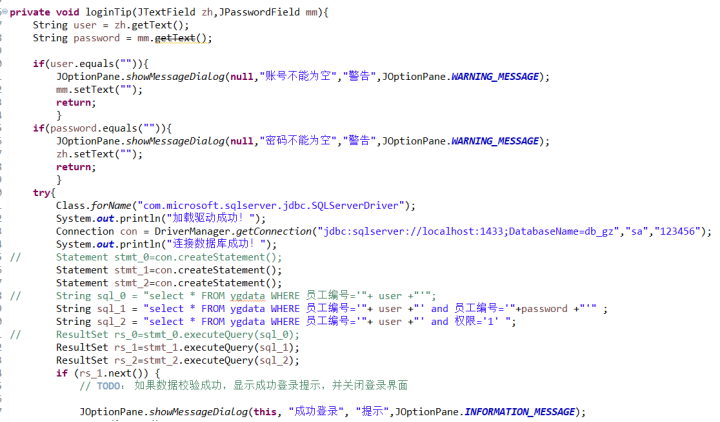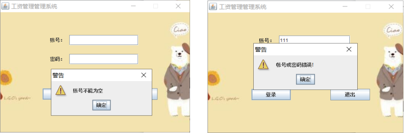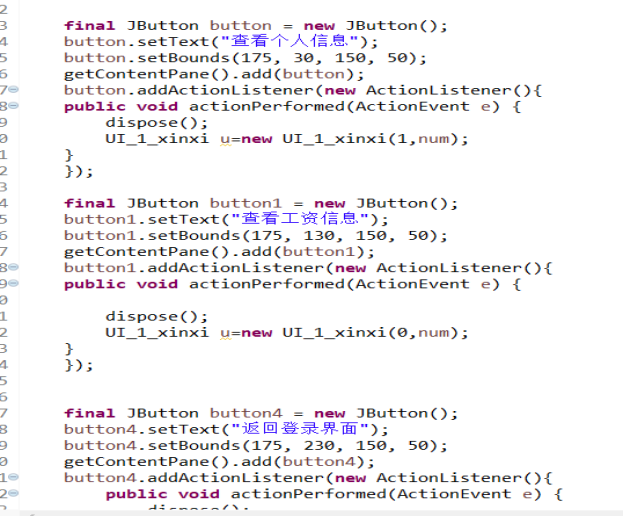 员工界面设计了三个按钮(分别是查看个人信息、查看工资信息以及返回登录界面)