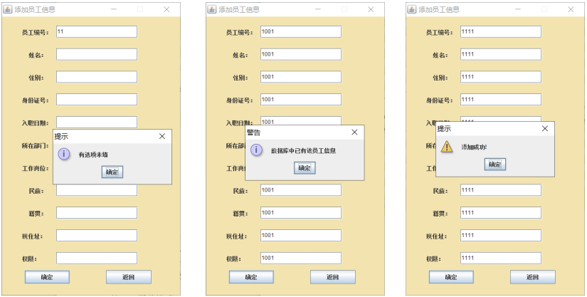 (2)测试添加员工信息:当有选项为空时,跳出提示框-有选项未填;否则查询数据库中是否已有该员工信息,有的话就跳出提示框-数据库中已有该员工信息,没有的话就将该条员工信息插入数据库中。