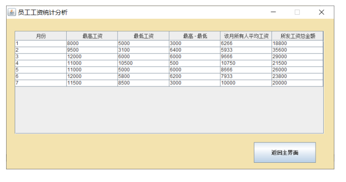 ③统计分析功能:统计当月所要核发的工资总金额,平均工资,以及最高和最低,最高-最低的工资金额。