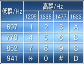 还有其他类型的CPT tone,由于用的相对较少,这里就不一一列出了。相对于CPT tone是单频音,DTMF tone是双频音,即用两个频率(一个高频和一个低频)的正弦波叠加去表示某个按键值。与CPT tone各国有自己的标准不同的是DTMF tone全球有统一的标准,下表列出了常用的16个按键值是由哪些高频音和低频音组合而成的: