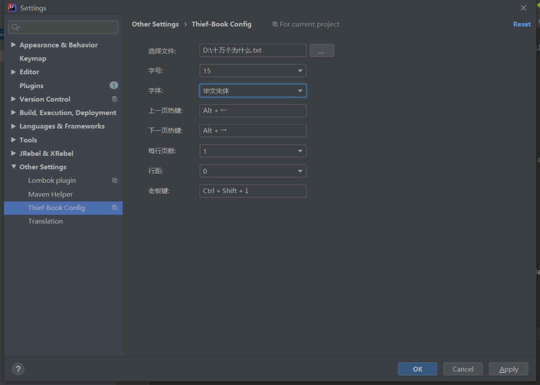 3、进入 IDEA 的 Setting 页面,找到 Other Settings\Thief-Book Config 选项,选择 txt 文件;