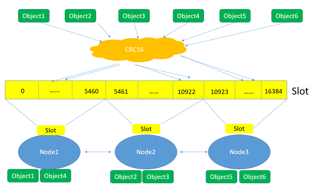 1, 对象保存到Redis之前先经过CRC16哈希到一个指定的Node上,例如Object4最终Hash到了Node1上。