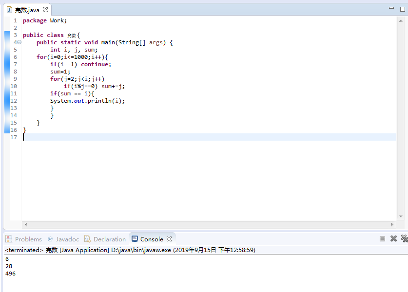 ⑤ 1、题目:一个数如果恰好等于它的因子之和,这个数就称为完数。编写程序输出1000以内的所有完数。 2、实验代码