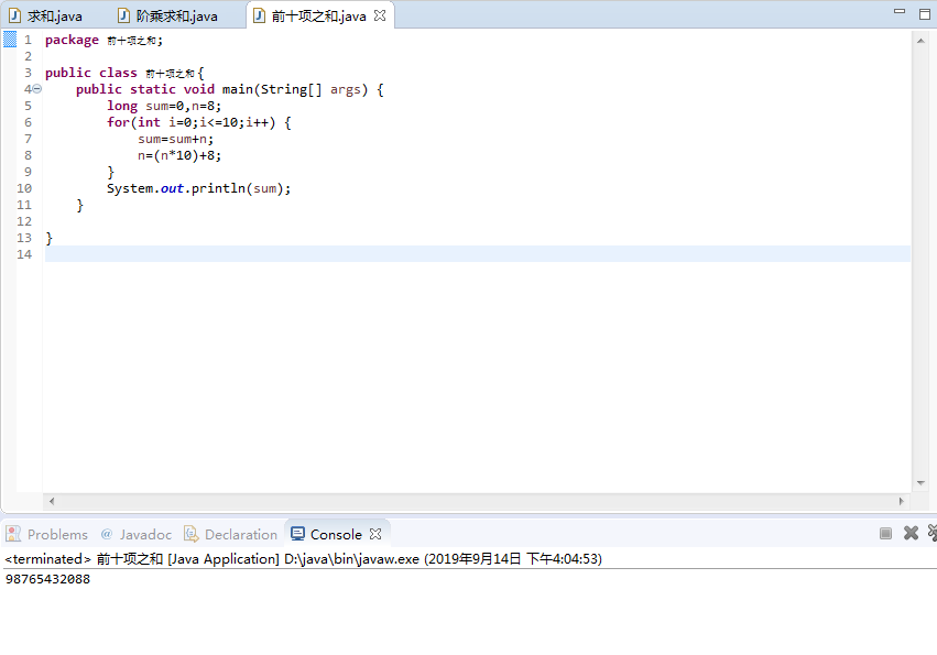 ④ 1、题目:编写Java程序,计算8+88+888+…前10项之和。 2、实验代码