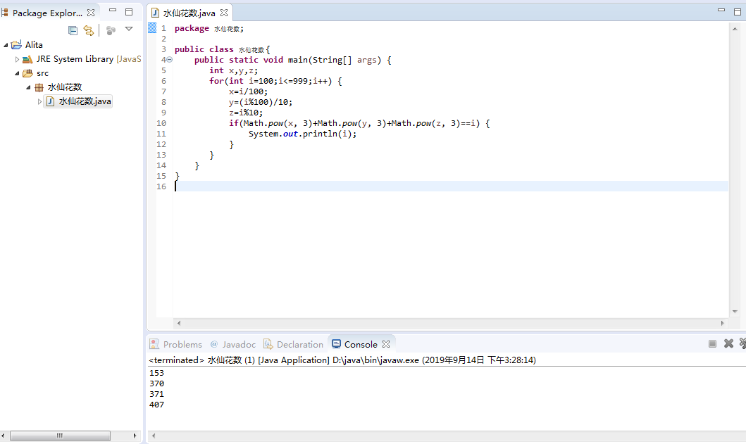 一、实验报告 ① 1、题目:打印输出所有的“水仙花数”,所谓“水仙花数”是指一个3位数,其中各位数字立方和等于该数本身。例如,153是一个“水仙花数”。 2、实验代码