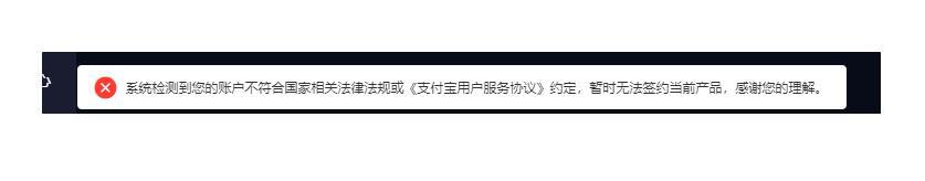 签约失败的文字提示为:系统检测到您的账户不符合国家相关法律法规或《支付宝用户服务协议》约定,暂时无法签约当前产品
