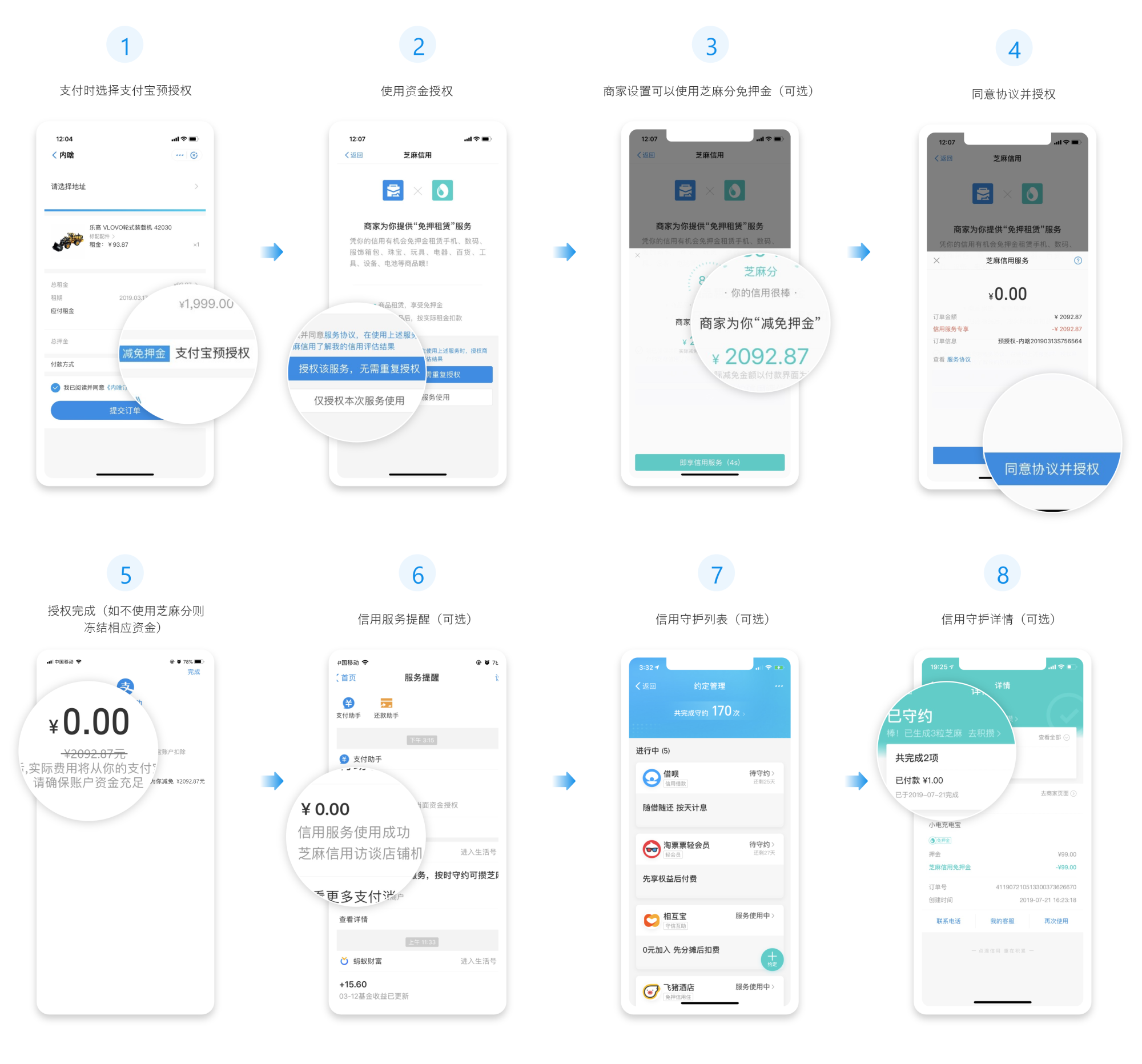 用用户端在使用资金预授权时的页面流程如下图所示,用户可以选择是否使用芝麻分进行授权。