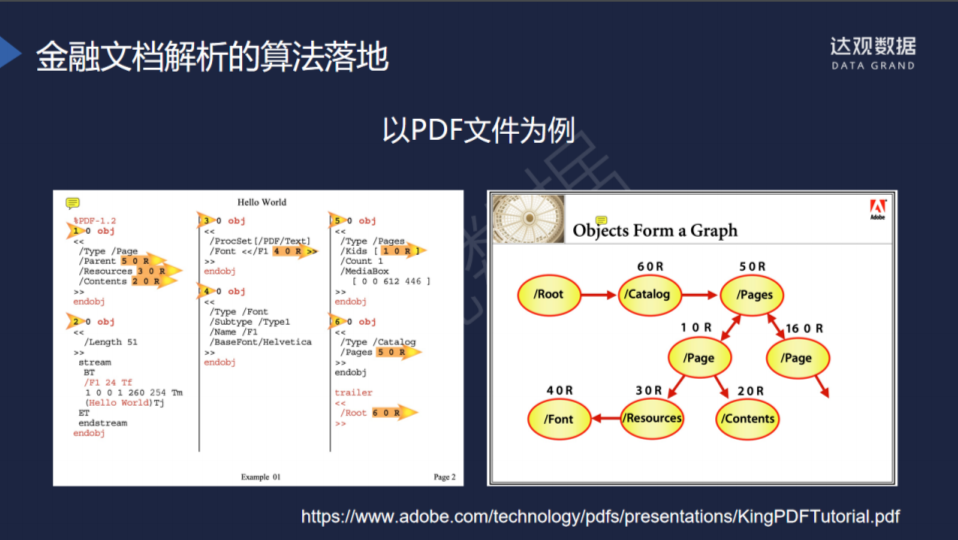以 pdf 为例讲一下的文档解析的具体算法落地。pdf 文件可能既包含的扫描件,也包含 pdf 的可复制的这种电子文档的格式,被广泛应用于日常生活中。这里列举了 Adobe 公司出的 Tutorial,pdf 文件本身的协议是让机器去读的,人一看到上图左边协议,他无法看懂,因为跟平时看到的 pdf 文件本身的段落、章节、表格是完全不一样的。