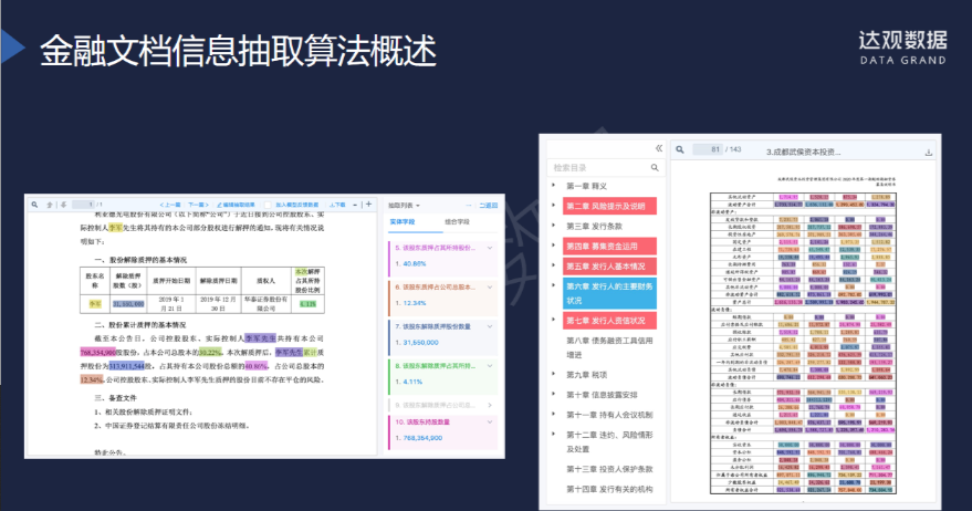 第一点,金融行业是文档密集型的行业,不管是券商、银行、保险、基金、私募,这些企业都有大量的文书处理,比如像招股书,债券募集书,这些都是投行业务等行业中会涉及到的。上市企业要提供他的派息公告,股权质押公告,重组公告,审计的会计师事务所要提供相应的审计报告,基金公司会提供基金合同,还有银行会处理各种各样函证,这些都是各种各样的文档。