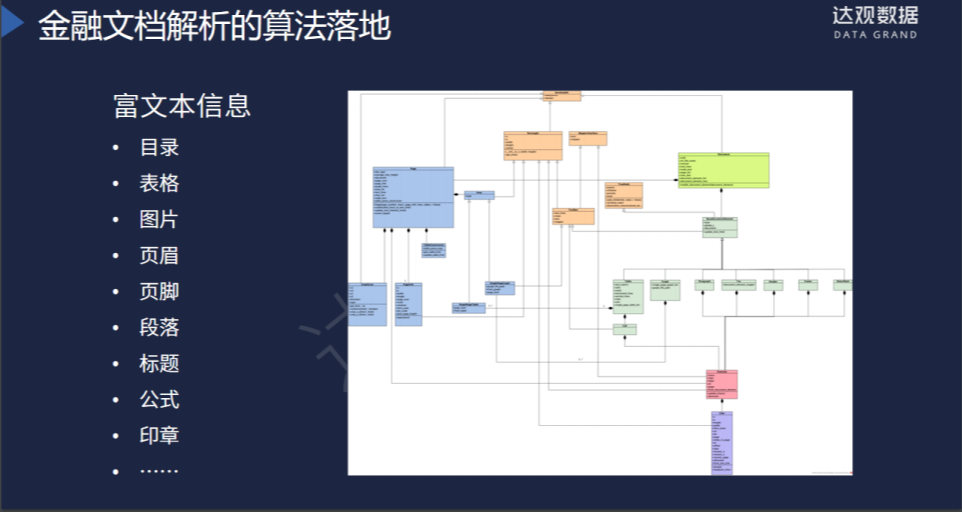 达观数据是将将日常人看到的结构转换总结出来,像目录、表格、图片、页眉、页脚,包括段落标题等等。还有论文里面经常出现的公式,甚至像刚看到印章。上图右边是达观数据总结出来静态类图,以这样的数据结构来表示一篇 pdf 文件和其中各种信息,把原本机器才能理解的协议,转化成了人类能够读懂的协议。