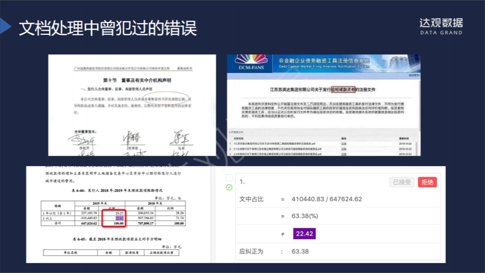 右下这幅图实际上是数字的校验错误,可以看到合计的比例实际上是对不上的。这些都是由于日常工作中因为疏忽导致的各种各样的风险。文档的机器智能处理,虽然不可能说完全 100% 地去解决各种各样的问题,但是可以有效地去降低人工处理过程中带来的潜在的风险。