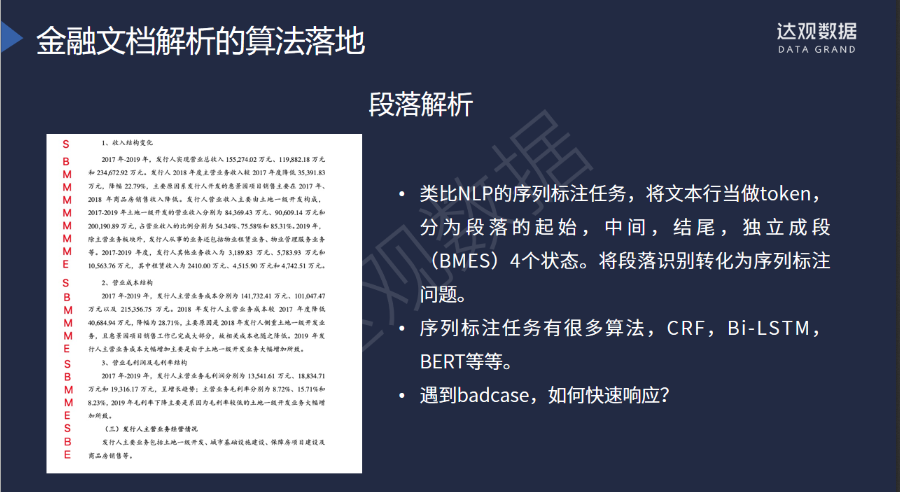 下面来介绍段落解析。NLP 里面有基础任务,比如说分词,是属于序列标注的一类任务。比如说分词里面,举个例子 “来自达观数据 “,可以分成三个词,、来自、达观数据,就是单独成词。