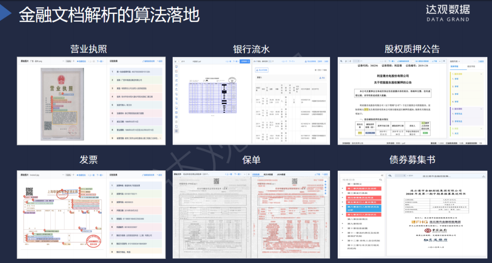 上图可以看到是刚刚提到的各种各样类型的文档,比如营业执照、发票以及保单这些属于格式相对比较固定的表格形式的文档类型。