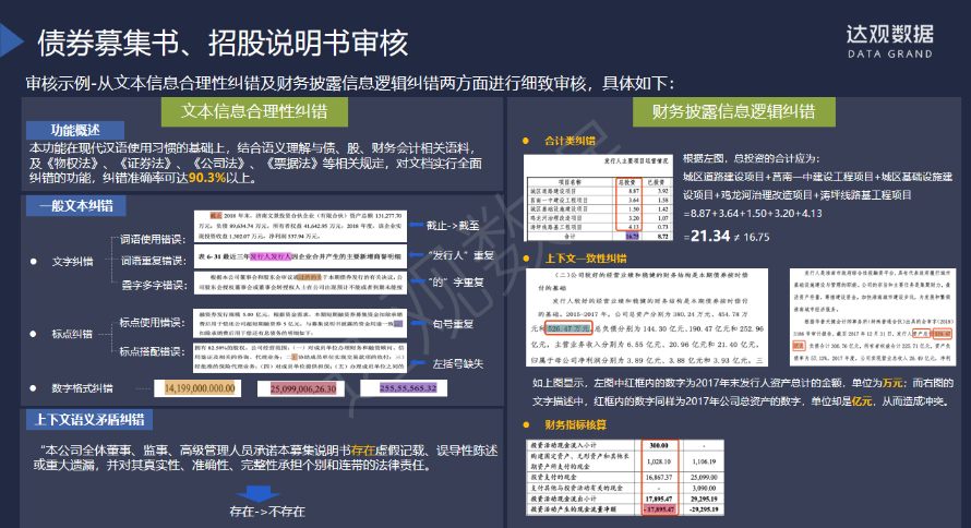 第四个是债券募集书,招股说明书的审核,如上截图也展示出来,把里面的正文里的金额,还有表格里面的金额去做抽取,抽取完了以后,时候就可以依照本文的公式、计算表格的占比是否是一致等内容作验证。