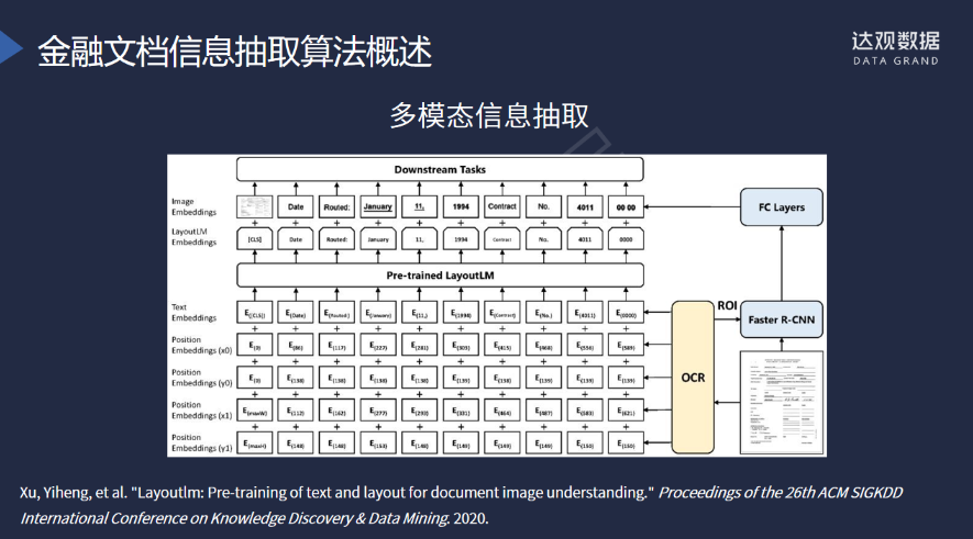 可以看出,实际上跟本文思路非常相似,比如说抽取表单的时候,利用的文本信息,去做 image 的文本信息(text embedded),加了 position embedded 层,就是把每个 OCR 识别出来的字符的框,X0,Y0,即左上角和框的坐标,分别去做了 4 层的 position embedded,又在基础之上叠加了 Image embedded,就是图像特征,比如刚才提到的这种字体字号等等这些信息,把这些各种各样特征考虑进来,去做了多模态的语言模型。