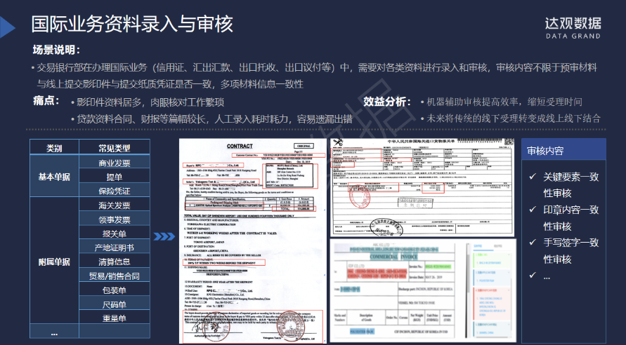 企业去提交贷款信息的时候,要提交财报,如何判断财报是否是做过手脚?购进关系是不是平衡的?资料和原始的文件的信息是不是一致?这些都要去做审核。如果去做人工录入,肉眼审核的效率也是实际上是非常低下的。此种情境下也可以考虑利用机器的抽取的结果来去做审核工作。