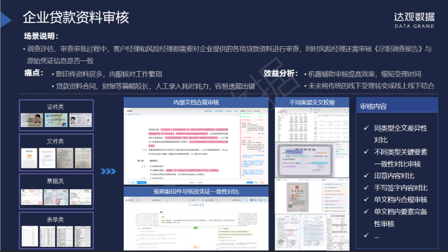 第二个是企业贷款资料审核,比如说银行客户经理在给企业客户办贷款时,像银行的普惠金融部,给小微企业做贷款时要评估、出具如上图这样的尽调报告。都需要把信息要去填入到银行内部通常叫信贷管理系统里,来做这样的风控的建模,评估的企业的风险等级、出具净值调查的报告。
