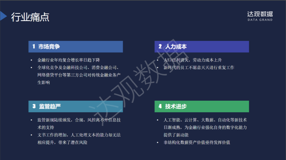 第四点是技术的进步,现在券商,银行,保险公司等都希望利用人工智能、云计算、大数据、机器人和自动化等技术强化金融行业的数字化能力,并要考量以前的非结构化数据资产能不能发挥应有的价值。