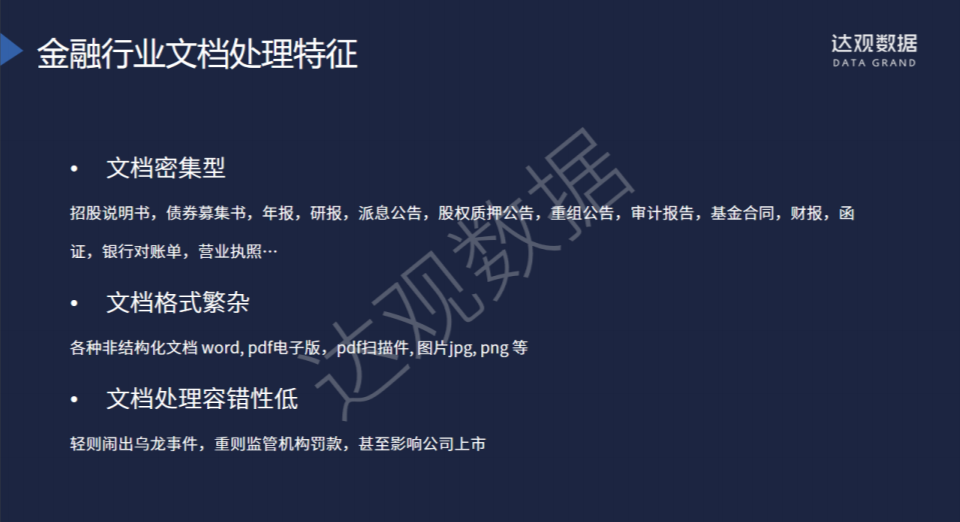 第三点是金融行业的特征,很强的监管性导致了该行业对于文档处理的容错性非常低。轻则可能闹出乌龙事件,严重时监管机构可能会对他进行警告,甚至做出罚款,更为严重时,对于券商而言可能会影响客户公司的上市。这些都是文档处理容错性低的体现。