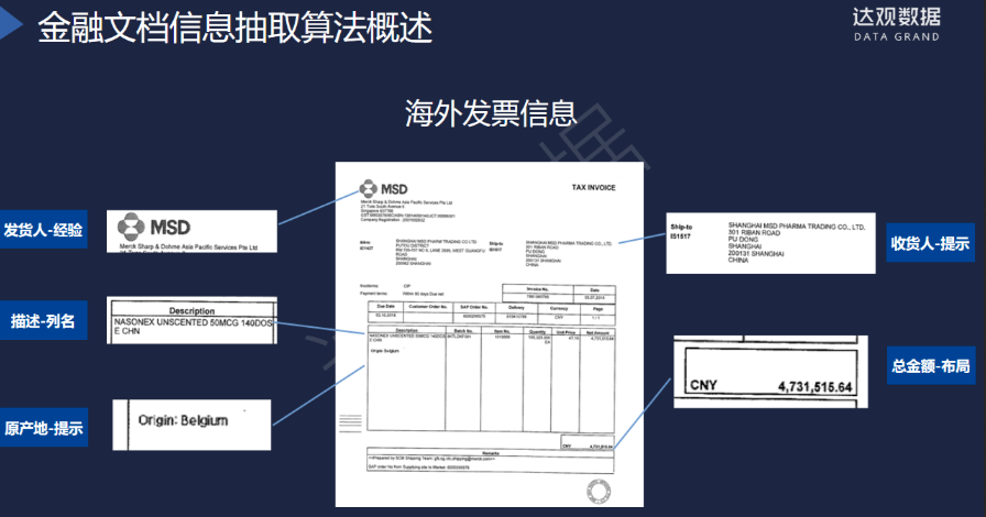 文本抽取的算法大家都比较熟悉,许多论文、博客各方面都介绍的非常多。这里给大家以海外发票信息为例,介绍文档抽取算法。海外发票信息这样文本实际上是有很多种不同的表现形式,字段有的出现在左上角、右上角,有的出现在表格里,格式也是千差万别,各个国家的发票可能都不太一样。