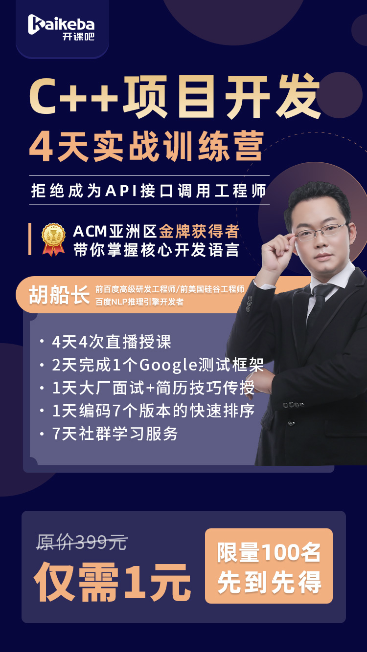 这个特训营他会全程亲自授课,通过4天时间带你深入C++核心编程,完成1个google测试框架,并教你如何撰写简历、应对大厂面试!