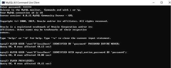 ALTER USER 'root'@'localhost' IDENTIFIED BY 'password' PASSWORD EXPIRE NEVER; #修改加密规则