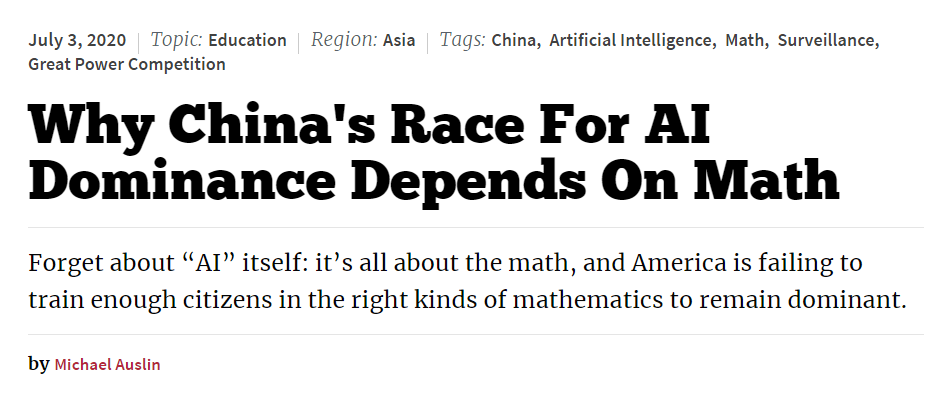 这篇报道在开篇即提到:「忘记人工智能本身吧,它只是一个数学问题。美国没有培养出足够擅长数学的公民,因此无法保持统治地位。」