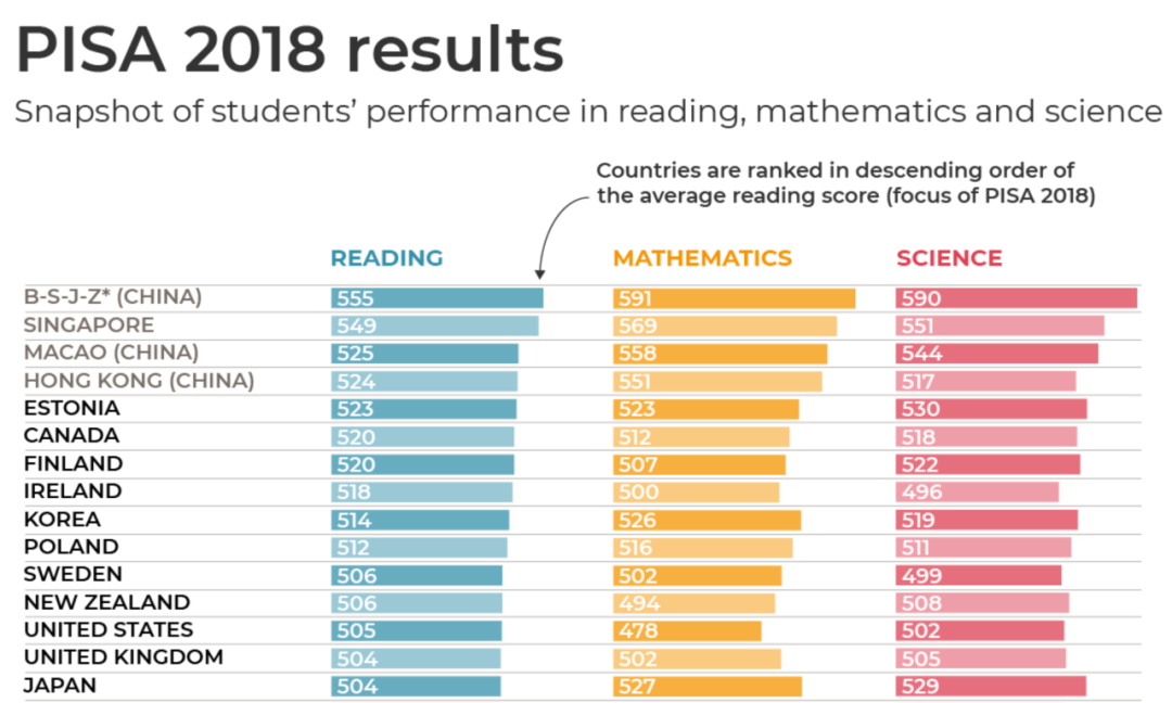 尽管中国的 AI 产业正在不断与美国拉近距离,但中国仍将眼光放得更为长远——他们在努力提高年轻人的数学水平。据经济合作与发展组织(OECD)对于全球 15 岁学生的最新一期统计,中国学生的数学能力全球第一(科学和阅读能力也是第一)。毫无疑问,中国正将重点放在 STEM(即科学、技术、工程和数学)教育上,其程度超过了美国和欧洲国家。