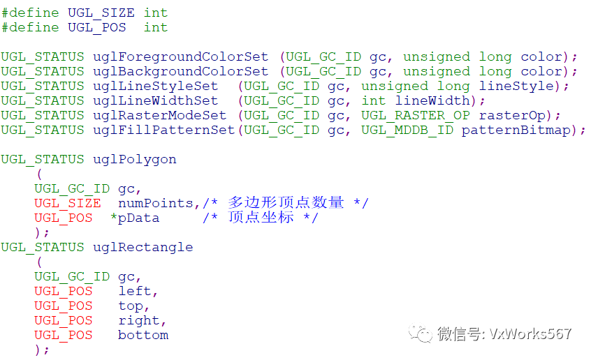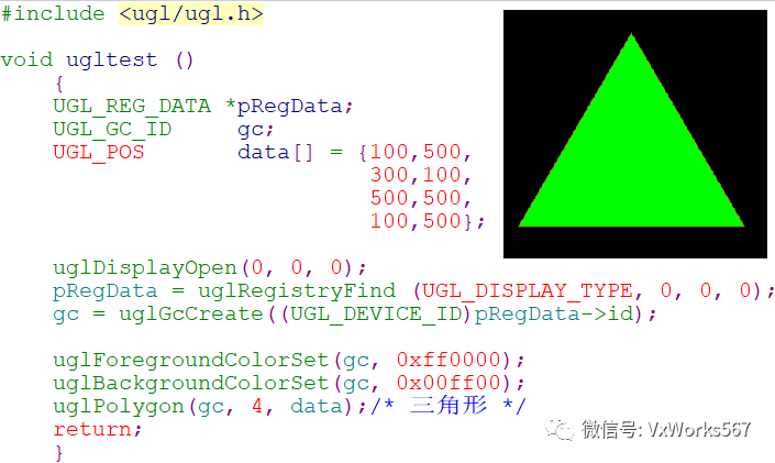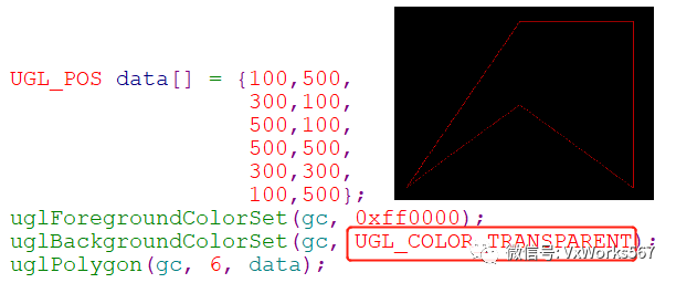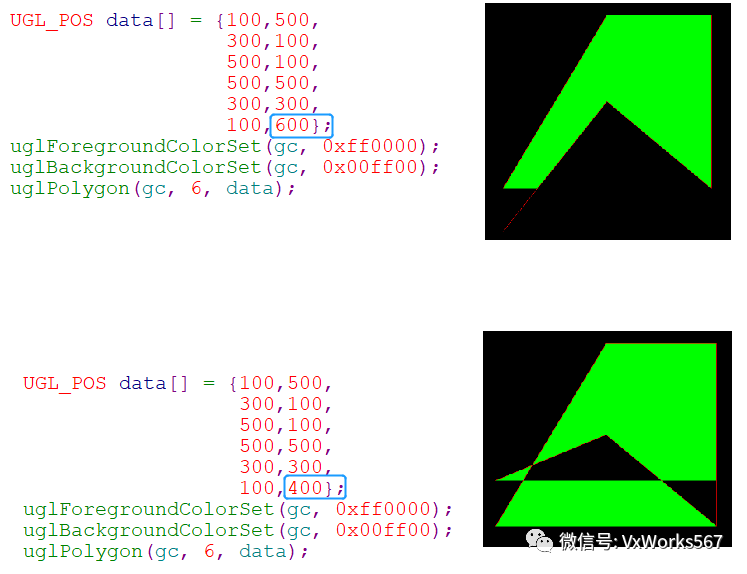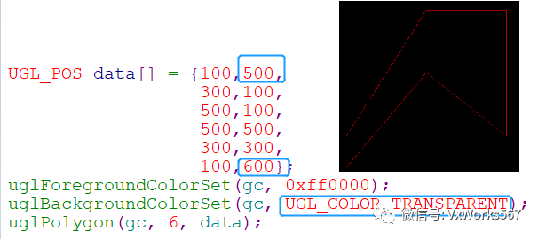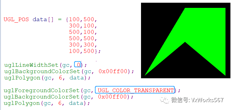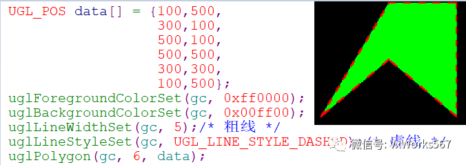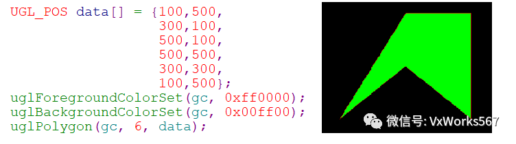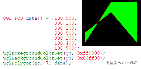 主要函数就是uglPolygon(),参数pData用于指明每个顶点的坐标,首尾两个点需要一致,所以其个数numPoints比多边形的实际顶点数要多一个,另外还需要指明前景色(边框)和背景色(填充)