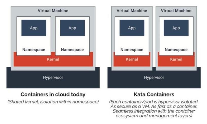 Kata Containers是新的虚拟机实现,可以实现和现在容器生态无缝连接,与时下最流行的容器编排工具k8s完美结合,提供容器的快速启动,和虚拟机的安全隔离,与Docker技术相比,容器之间不共用内核,使得隔离性更好。