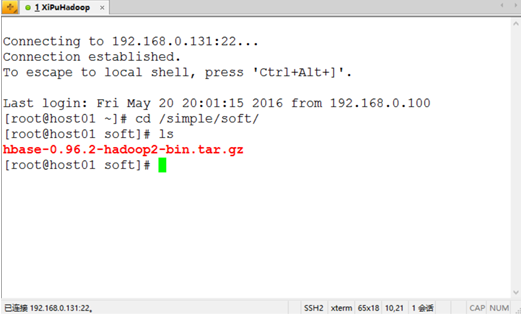 进入/simple/soft目录,执行ls命令,发现hbase安装包hbase-0.96.2-hadoop2-bin.tar.gz。如下图1所示。