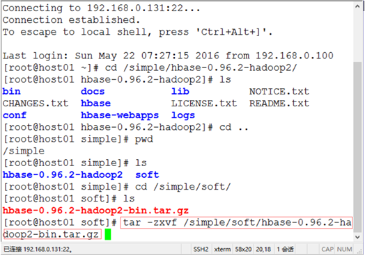 执行命令tar -zxvf /simple/soft/hbase-0.96.2-hadoop2-bin.tar.gz,进行安装包解压。如下图2所示。