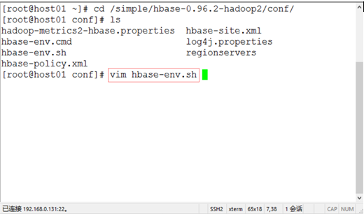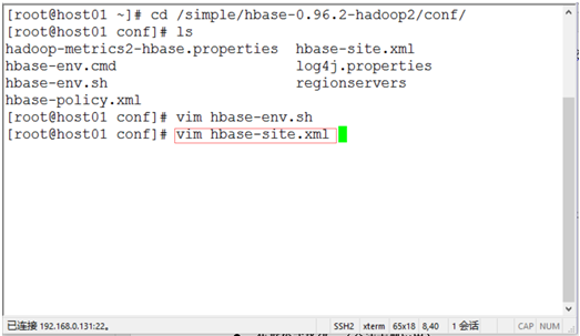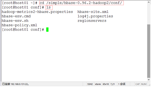 切换到hbase的conf目录下并查看。发现conf目录下有配置文件hbase-env.sh和hbase-site.xml。如下图3所示。