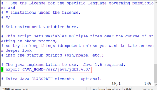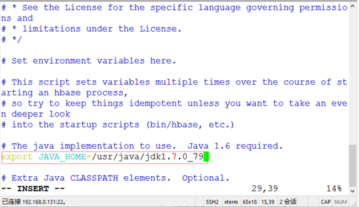 在$HBASE/conf目录下执行命令:vim hbase-env.sh,按i键之后进入编辑状态,在第29行去掉注释,改成本机jdk路径: export JAVA_HOME=/usr/java/jdk1.7.0_79。如下图4,5,6所示。