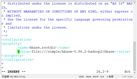 在$HBASE/conf目录下执行vim hbase-site.xml,并修改配置文件hbase-site.xml,指定hbase存放数据的根目录,内容如下。