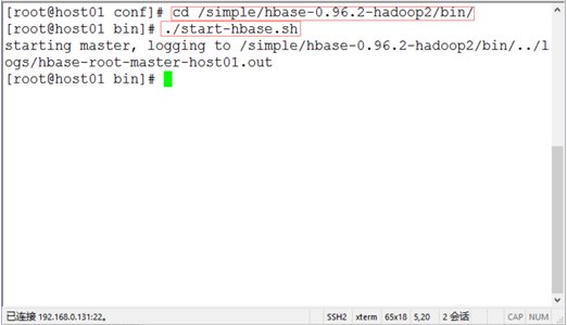 进入目录/simple/hbase-0.96.2-hadoop2/bin/,执行命令./start-hbase.sh启动hbase。如下图9所示。