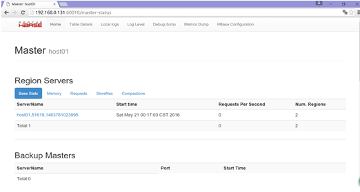 在浏览器的地址栏中输入http://192.168.0.131:60010/(本IP为自己虚拟机上面的IP)。可以查看到Hbase管理界面。如下图11所示。