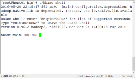执行./hbase shell命令,可以进入hbase的命令行模式。如下图12所示。