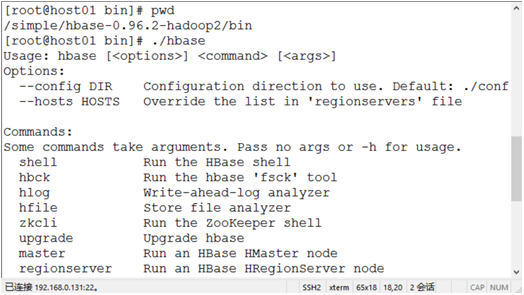 在目录/simple/hbase-0.96.2-hadoop2/bin下执行命令./hbase。发现一些操作hbase的提示。如下图13所示。